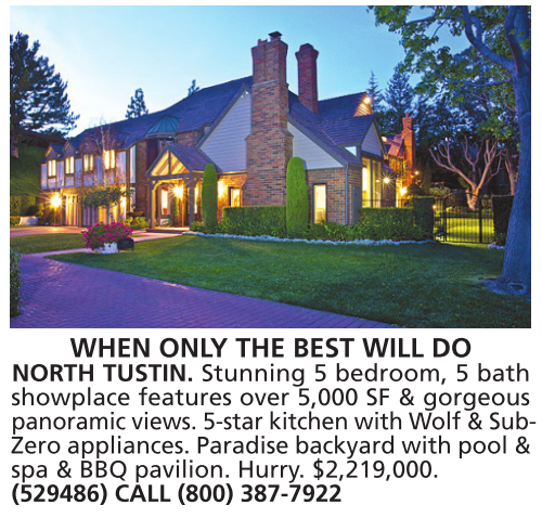 WHEN ONLY THE BEST WILL DO NORTH TUSTIN. Stunning 5 bedroom, 5 bath showplace features over 5,000 SF & gorgeous panoramic views. 5-star kitchen with Wolf & Sub- Zero appliances. Paradise backyard with pool & spa & BBQ pavilion. Hurry. $2,219,000. (529486) CALL (800) 387-7922
