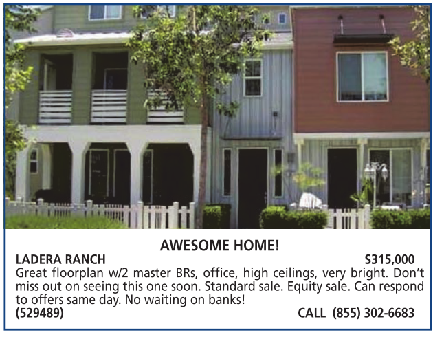 LADERA RANCH $315,000 Great floorplan w/2 master BRs, office, high ceilings, very bright. Don’t miss out on seeing this one soon. Standard sale. Equity sale. Can respond to offers same day. No waiting on banks! (529489) CALL (855) 302-6683