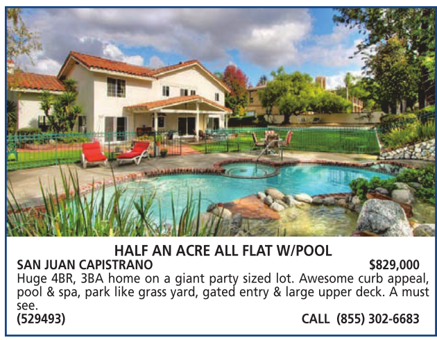 HALF AN ACRE ALL FLAT W/POOL SAN JUAN CAPISTRANO $829,000 Huge 4BR, 3BA home on a giant party sized lot. Awesome curb appeal, pool & spa, park like grass yard, gated entry & large upper deck. A must see. (529493) CALL (855) 302-6683
