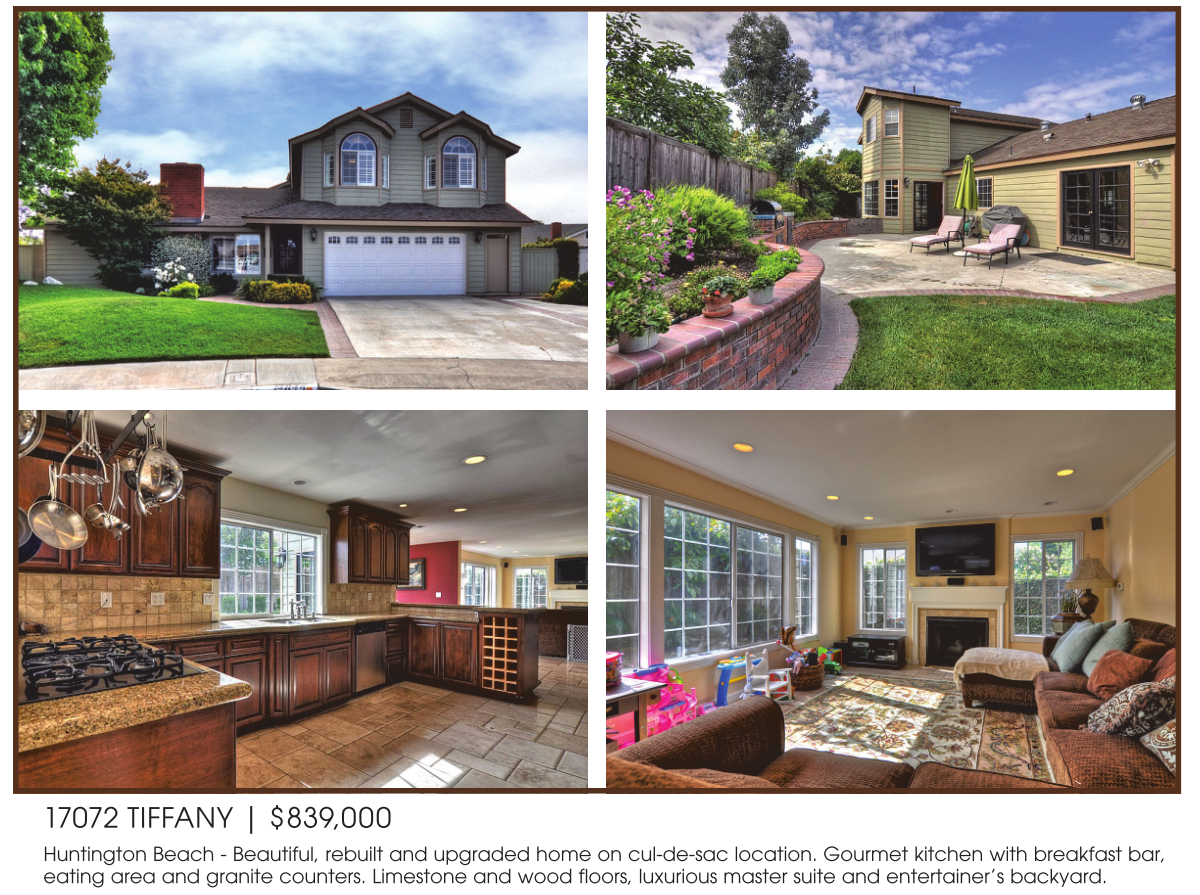 17072 TIFFANY | $839,000 Huntington Beach - Beautiful, rebuilt and upgraded home on cul-de-sac location. Gourmet kitchen with breakfast bar, eating area and granite counters. Limestone and wood floors, luxurious master suite and entertainer’s backyard.