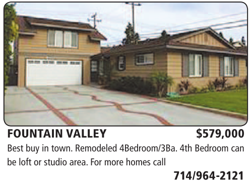 FOUNTAIN VALLEY $579,000 Best buy in town. Remodeled 4Bedroom/3Ba. 4th Bedroom can be loft or studio area. For more homes call 714/964-2121
