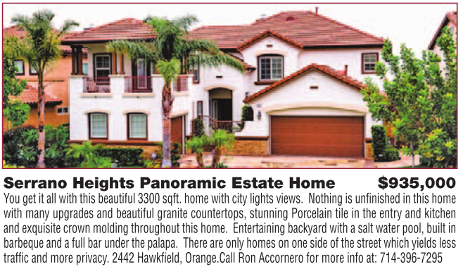 Serrano Heights Panoramic Estate Home $935,000 You get it all with this beautiful 3300 sqft. home with city lights views. Nothing is unfi nished in this home with many upgrades and beautiful granite countertops, stunning Porcelain tile in the entry and kitchen and exquisite crown molding throughout this home. Entertaining backyard with a salt water pool, built in barbeque and a full bar under the palapa. There are only homes on one side of the street which yields less traffi c and more privacy. 2442 Hawkfield, Orange.Call Ron Accornero for more info at: 714-396-7295
