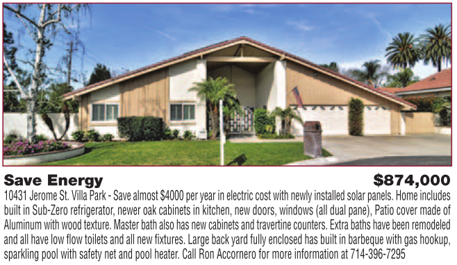 and all have low flow toilets and all new fixtures. Large back yard fully enclosed has built in barbeque with gas hookup, sparkling pool with safety net and pool heater. Call Ron Accornero for more information at 714-396-7295