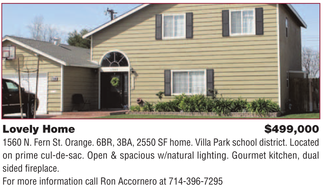 Lovely Home $499,000 1560 N. Fern St. Orange. 6BR, 3BA, 2550 SF home. Villa Park school district. Located on prime cul-de-sac. Open & spacious w/natural lighting. Gourmet kitchen, dual sided fi replace. For more information call Ron Accornero at 714-396-7295