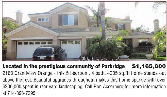 Located in the prestigious community of Parkridge $1,165,000 2168 Grandview Orange - this 5 bedroom, 4 bath, 4205 sq.ft. home stands out above the rest. Beautiful upgrades throughout makes this home sparkle with over $200,000 spent in rear yard landscaping. Call Ron Accornero for more information at 714-396-7295