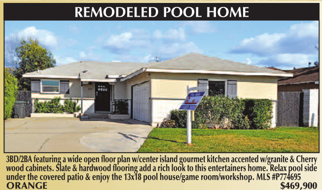 REMODELED POOL HOME 3BD/2BA featuring a wide open floor plan w/center island gourmet kitchen accented w/granite & Cherry wood cabinets. Slate & hardwood flooring add a rich look to this entertainers home. Relax pool side under the covered patio & enjoy the 13x18 pool house/game room/workshop. MLS #P774695 ORANGE $469,900