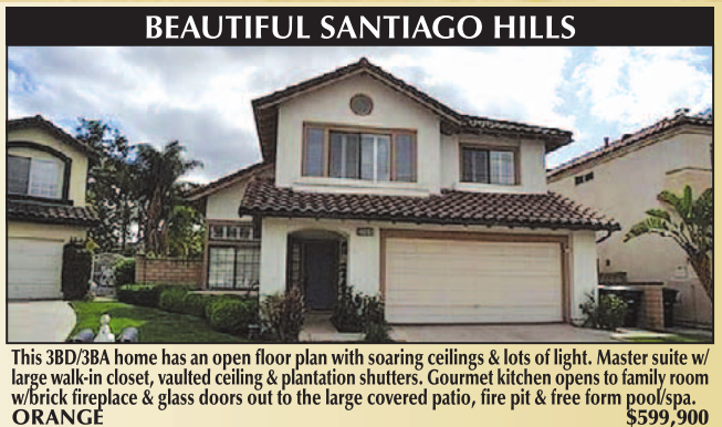 This 3BD/3BA home has an open floor plan with soaring ceilings & lots of light. Master suite w/ large walk-in closet, vaulted ceiling & plantation shutters. Gourmet kitchen opens to family room w/brick fireplace & glass doors out to the large covered patio, fire pit & free form pool/spa. ORANGE $599,900