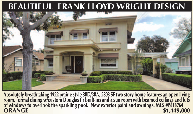 BEAUTIFUL FRANK LLOYD WRIGHT DESIGN Absolutely breathtaking 1922 prairie style 3BD/3BA, 2303 SF two story home features an open living room, formal dining w/custom Douglas fir built-ins and a sun room with beamed ceilings and lots of windows to overlook the sparkling pool. New exterior paint and awnings. MLS #P818764 ORANGE $1,149,000
