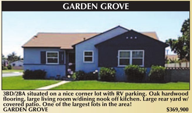 3BD/2BA situated on a nice corner lot with RV parking. Oak hardwood flooring, large living room w/dining nook off kitchen. Large rear yard w/ covered patio. One of the largest lots in the area! GARDEN GROVE $369,900
