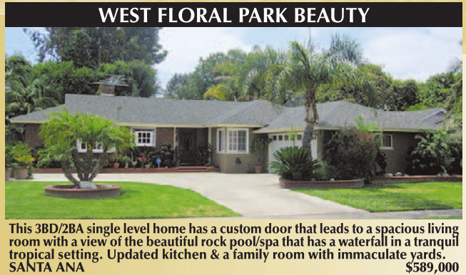 This 3BD/2BA single level home has a custom door that leads to a spacious living room with a view of the beautiful rock pool/spa that has a waterfall in a tranquil tropical setting. Updated kitchen & a family room with immaculate yards. SANTA ANA $589,000