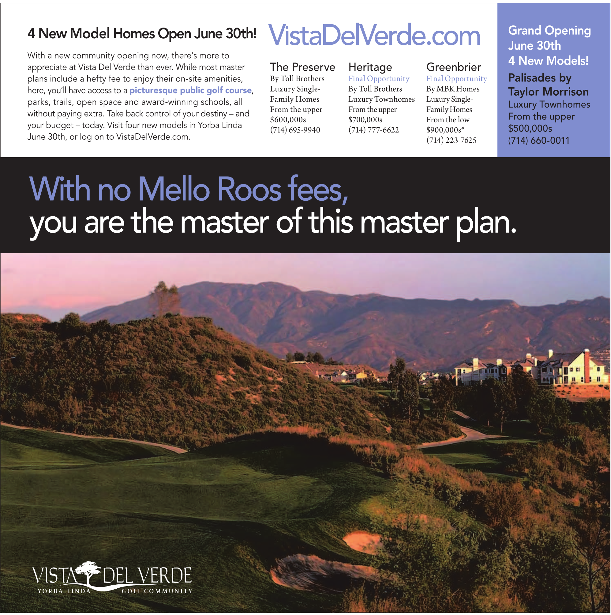 With a new community opening now, there’s more to appreciate at Vista Del Verde than ever. While most master plans include a hefty fee to enjoy their on-site amenities, here, you’ll have access to a picturesque public golf course, parks, trails, open space and award-winning schools, all without paying extra. Take back control of your destiny – and your budget – today. Visit four new models in Yorba Linda June 30th, or log on to VistaDelVerde.com.