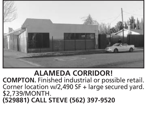 COMPTON. Finished industrial or possible retail. Corner location w/2,490 SF + large secured yard. $2,739/MONTH. (529881) CALL STEVE (562) 397-9520