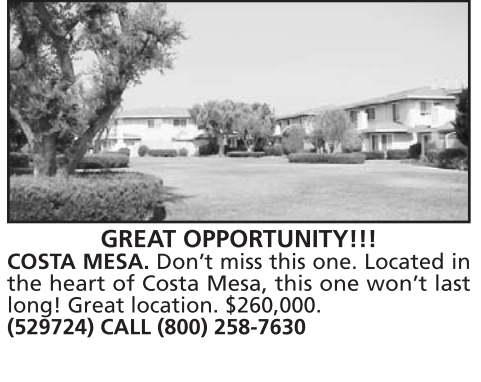 COSTA MESA. Don’t miss this one. Located in the heart of Costa Mesa, this one won’t last long! Great location. $260,000. (529724) CALL (800) 258-7630