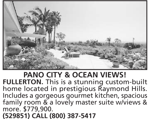 FULLERTON. This is a stunning custom-built home located in prestigious Raymond Hills. Includes a gorgeous gourmet kitchen, spacious family room & a lovely master suite w/views & more. $779,900. (529851) CALL (800) 387-5417