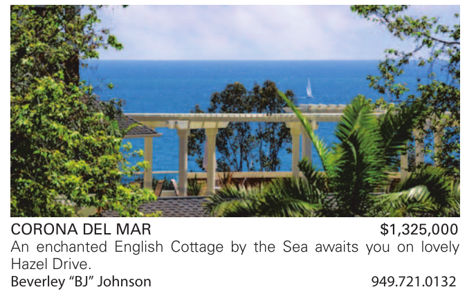 CORONA DEL MAR $1,325,000 An enchanted English Cottage by the Sea awaits you on lovely Hazel Drive. Beverley “BJ” Johnson 949.721.0132