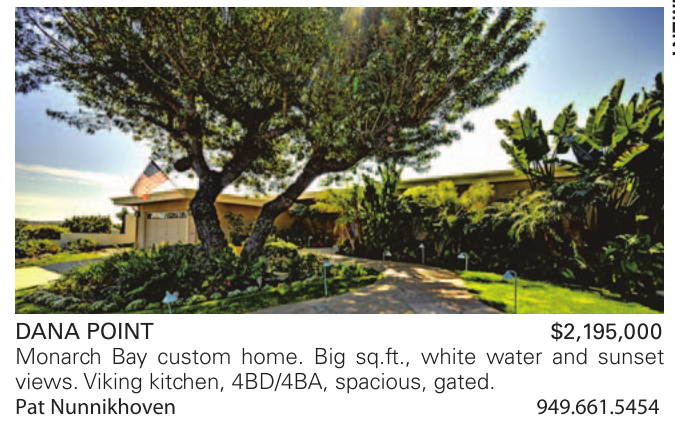 DANA POINT $2,195,000 Monarch Bay custom home. Big sq.ft., white water and sunset views. Viking kitchen, 4BD/4BA, spacious, gated. Pat Nunnikhoven 949.661.5454