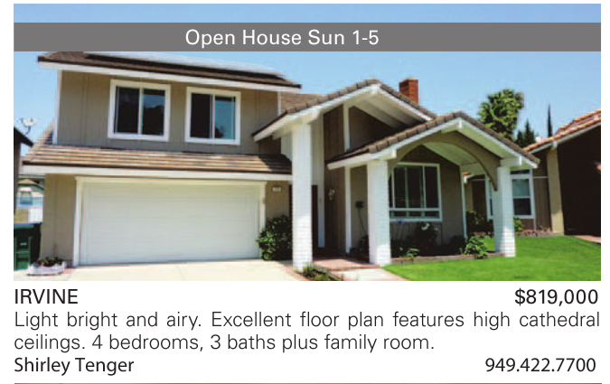 IRVINE $819,000 Light bright and airy. Excellent floor plan features high cathedral ceilings. 4 bedrooms, 3 baths plus family room. Shirley Tenger 949.422.7700