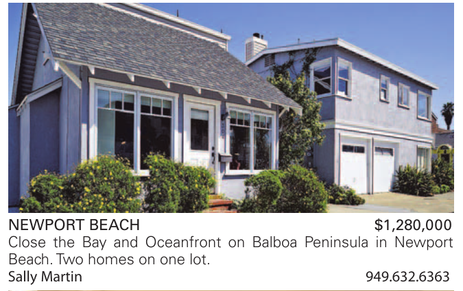 NEWPORT BEACH $1,280,000 Close the Bay and Oceanfront on Balboa Peninsula in Newport Beach. Two homes on one lot. Sally Martin 949.632.6363