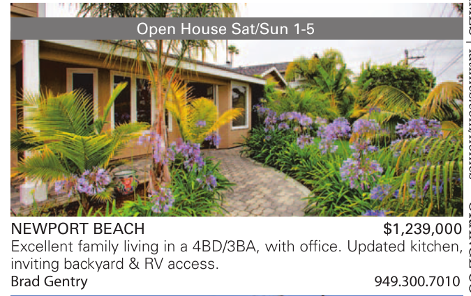 NEWPORT BEACH $1,239,000 Excellent family living in a 4BD/3BA, with office. Updated kitchen, inviting backyard & RV access. Brad Gentry 949.300.7010