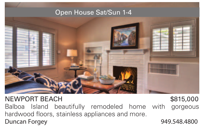 NEWPORT BEACH $815,000 Balboa Island beautifully remodeled home with gorgeous hardwood floors, stainless appliances and more. Duncan Forgey 949.548.4800