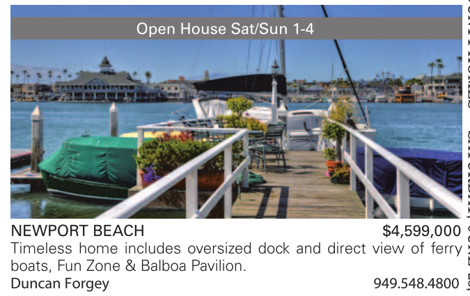 NEWPORT BEACH $4,599,000 Timeless home includes oversized dock and direct view of ferry boats, Fun Zone & Balboa Pavilion. Duncan Forgey 949.548.4800