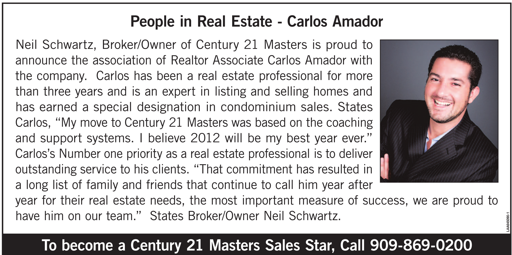 People in Real Estate - Carlos Amador Neil Schwartz, Broker/Owner of Century 21 Masters is proud to announce the association of Realtor Associate Carlos Amador with the company. Carlos has been a real estate professional for more than three years and is an expert in listing and selling homes and has earned a special designation in condominium sales. States Carlos, “My move to Century 21 Masters was based on the coaching and support systems. I believe 2012 will be my best year ever.” Carlos’s Number one priority as a real estate professional is to deliver outstanding service to his clients. “That commitment has resulted in a long list of family and friends that continue to call him year after year for their real estate needs, the most important measure of success, we are proud to have him on our team.” States Broker/Owner Neil Schwartz. To become a Century 21 Masters Sales Star, Call 909-869-0200