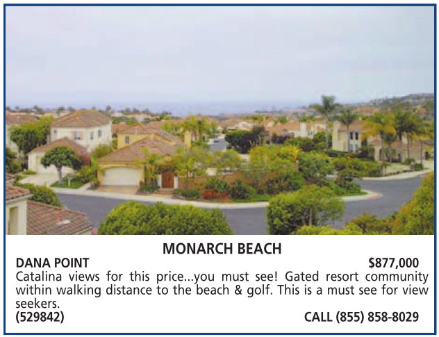 MONARCH BEACH DANA POINT $877,000 Catalina views for this price...you must see! Gated resort community within walking distance to the beach & golf. This is a must see for view seekers. (529842) CALL (855) 858-8029