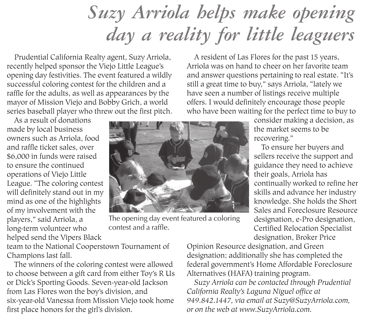 Prudential California Realty agent, Suzy Arriola, recently helped sponsor the Viejo Little League’s opening day festivities. The event featured a wildly successful coloring contest for the children and a raffle for the adults, as well as appearances by the mayor of Mission Viejo and Bobby Grich, a world series baseball player who threw out the first pitch.