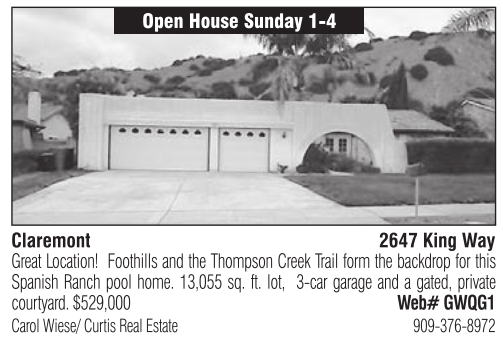 Great Location! Foothills and the Thompson Creek Trail form the backdrop for this Spanish Ranch pool home. 13,055 sq. ft. lot, 3-car garage and a gated, private courtyard. $529,000 Web# GWQG1 Carol Wiese/ Curtis Real Estate 909-376-8972