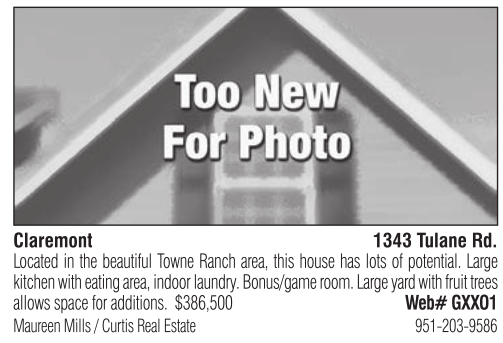 Located in the beautiful Towne Ranch area, this house has lots of potential. Large kitchen with eating area, indoor laundry. Bonus/game room. Large yard with fruit trees allows space for additions. $386,500 Web# GXXO1 Maureen Mills / Curtis Real Estate 951-203-9586