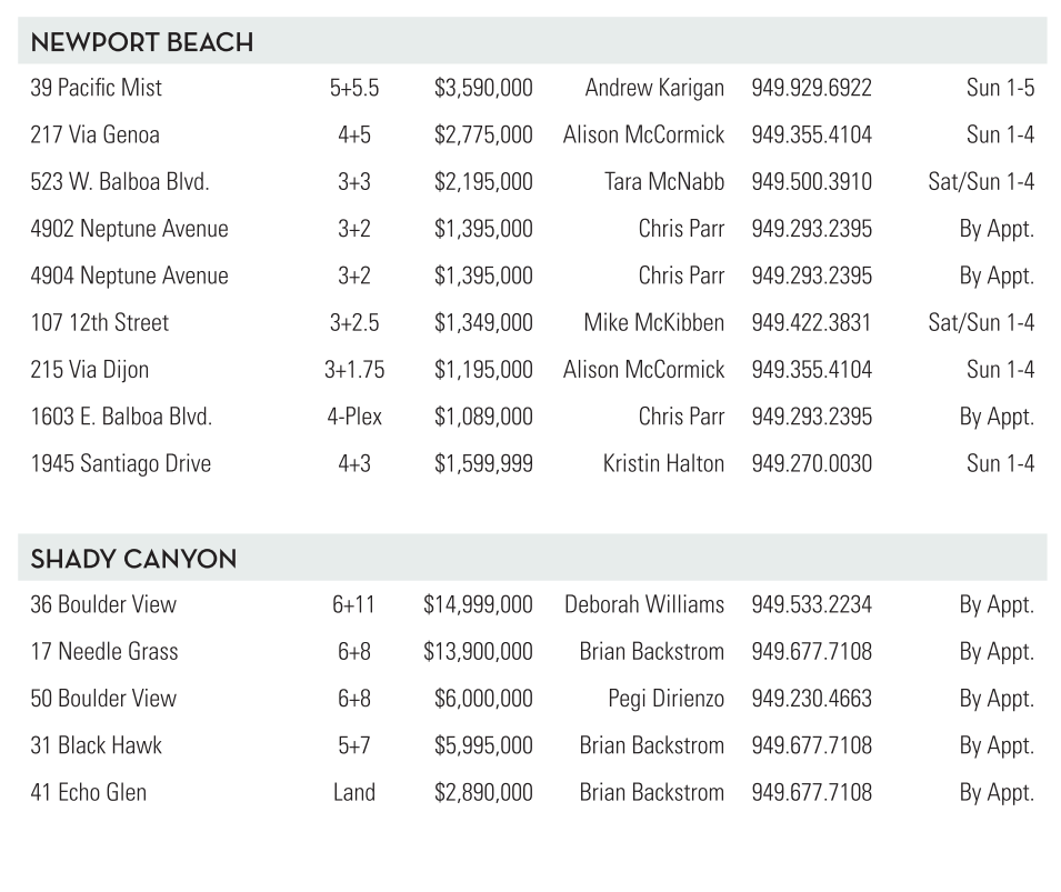 NEWPORT BEACH 39 Pacific Mist 5+5.5 $3,590,000 Andrew Karigan 949.929.6922 Sun 1-5 217 Via Genoa 4+5 $2,775,000 Alison McCormick 949.355.4104 Sun 1-4 523 W. Balboa Blvd. 3+3 $2,195,000 Tara McNabb 949.500.3910 Sat/Sun 1-4 4902 Neptune Avenue 3+2 $1,395,000 Chris Parr 949.293.2395 By Appt. 4904 Neptune Avenue 3+2 $1,395,000 Chris Parr 949.293.2395 By Appt. 107 12th Street 3+2.5 $1,349,000 Mike McKibben 949.422.3831 Sat/Sun 1-4 215 Via Dijon 3+1.75 $1,195,000 Alison McCormick 949.355.4104 Sun 1-4 1603 E. Balboa Blvd. 4-Plex $1,089,000 Chris Parr 949.293.2395 By Appt. 1945 Santiago Drive 4+3 $1,599,999 Kristin Halton 949.270.0030 Sun 1-4 SHADY CANYON 36 Boulder View 6+11 $14,999,000 Deborah Williams 949.533.2234 By Appt. 17 Needle Grass 6+8 $13,900,000 Brian Backstrom 949.677.7108 By Appt. 50 Boulder View 6+8 $6,000,000 Pegi Dirienzo 949.230.4663 By Appt. 31 Black Hawk 5+7 $5,995,000 Brian Backstrom 949.677.7108 By Appt. 41 Echo Glen Land $2,890,000 Brian Backstrom 949.677.7108 By Appt. See also