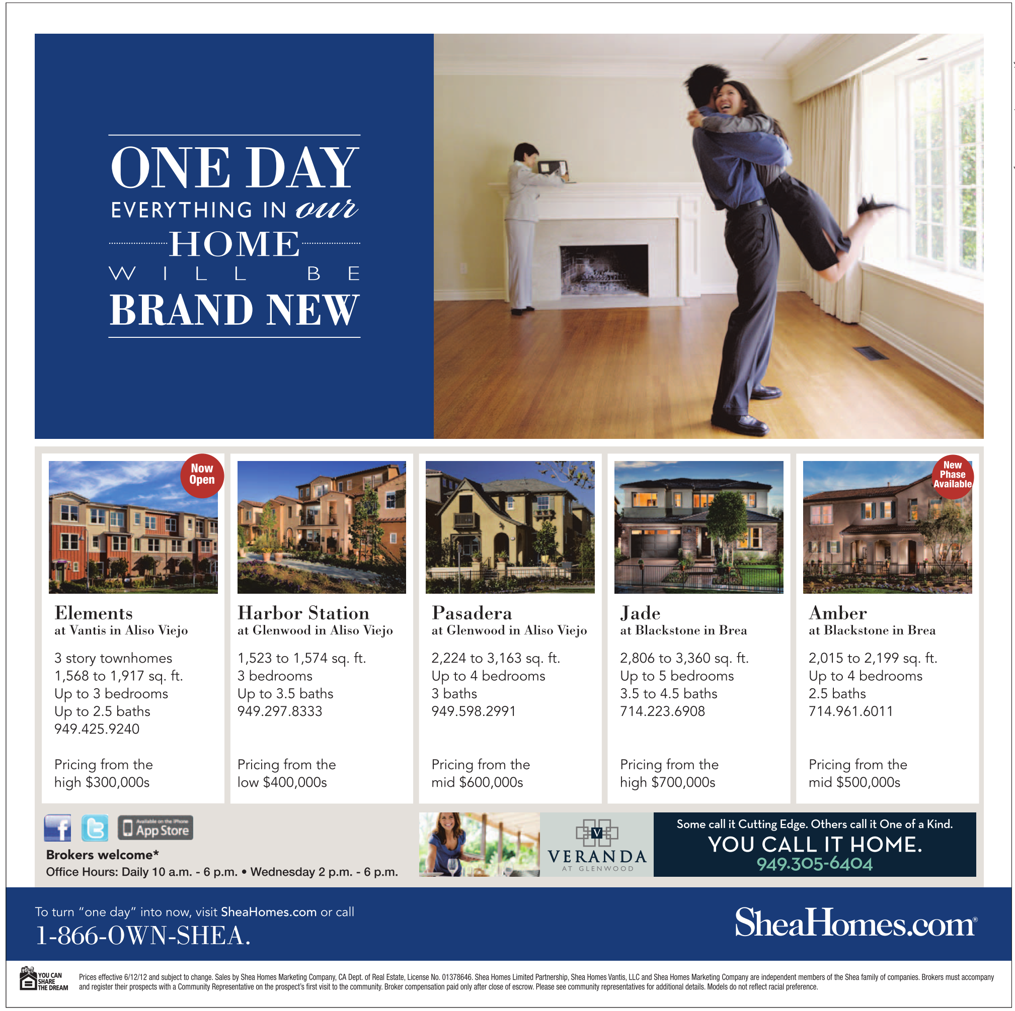 Prices effective 6/12/12 and subject to change. Sales by Shea Homes Marketing Company, CA Dept. of Real Estate, License No. 01378646. Shea Homes Limited Partnership, Shea Homes Vantis, LLC and Shea Homes Marketing Company are independent members of the Shea family of companies. Brokers must accompany and register their prospects with a Community Representative on the prospect’s first visit to the community. Broker compensation paid only after close of escrow. Please see community representatives for additional details. Models do not reflect racial preference.