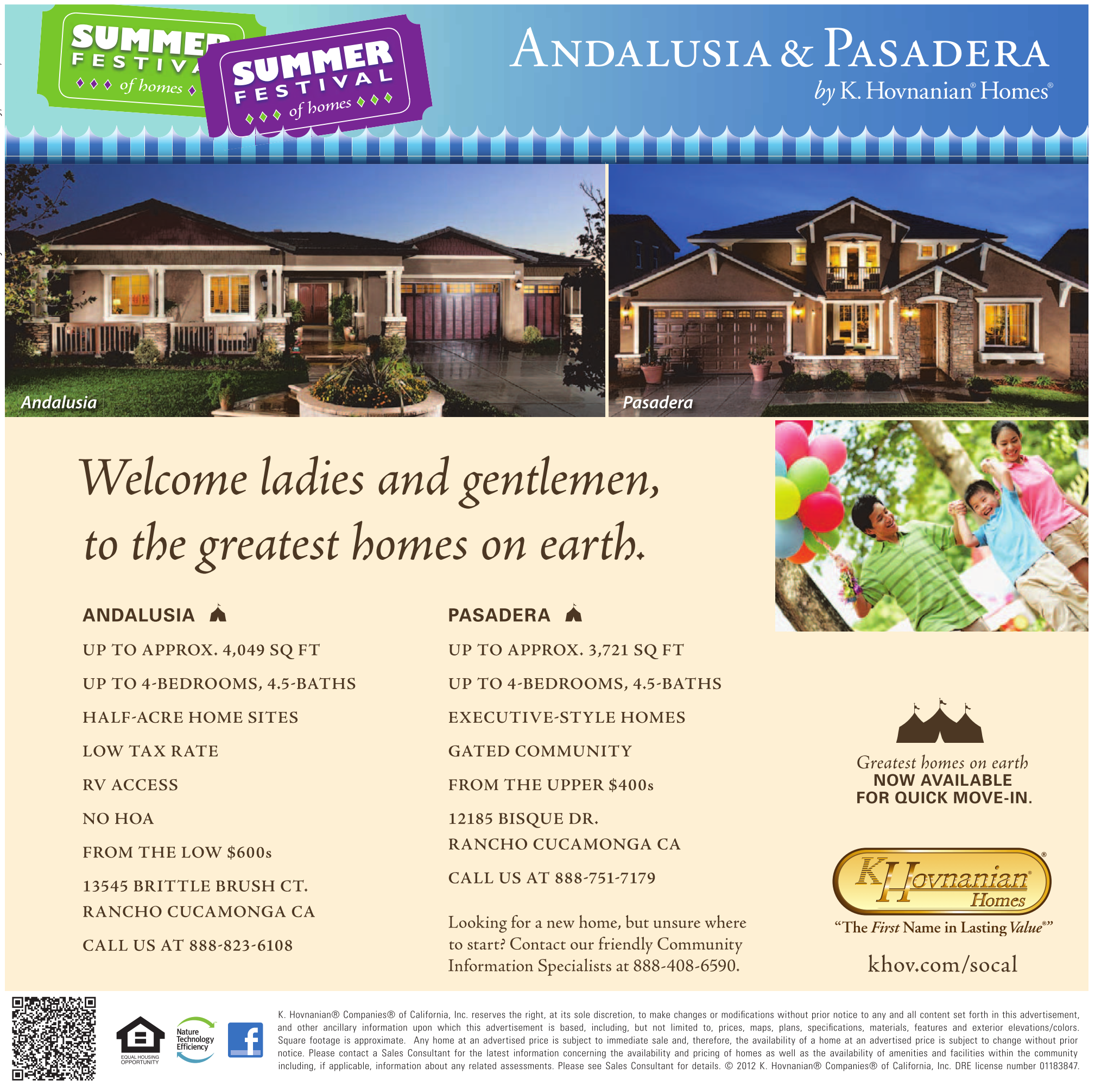 Andalusi a & Pasadera by K.Hovnanian ® Homes ® Andalusia Pasadera Welcome ladies and gentlemen, to the greatest homes on earth. ANDALUSIA UP TO APPROX. 4,049 SQ FT UP TO 4-BEDROOMS, 4.5-BATHS HALF-ACRE HOME SITES LOW TAX RATE RV ACCESS NO HOA FROM THE LOW $600s 13545 BRITTLE BRUSH CT. RANCHO CUCAMONGA CA CALL US AT 888-823-6108 PASADERA UP TO APPROX. 3,721 SQ FT UP TO 4-BEDROOMS, 4.5-BATHS EXECUTIVE-STYLE HOMES GATED COMMUNITY FROM THE UPPER $400s 12185 BISQUE DR. RANCHO CUCAMONGA CA CALL US AT 888-751-7179 Looking for a new home, but unsure where to start? Contact our friendly Community Information Specialists at 888-408-6590. Greatest homes on earth NOW AVAILABLE FOR QUICK MOVE-IN. khov.com/socal K. Hovnanian® Companies® of California, Inc. reserves the right, at its sole discretion, to make changes or modifications without prior notice to any and all content set forth in this advertisement, and other ancillary information upon which this advertisement is based, including, but not limited to, prices, maps, plans, specifications, materials, features and exterior elevations/colors. Square footage is approximate. Any home at an advertised price is subject to immediate sale and, therefore, the availability of a home at an advertised price is subject to change without prior notice. Please contact a Sales Consultant for the latest information concerning the availability and pricing of homes as well as the availability of amenities and facilities within the community including, if applicable, information about any related assessments. Please see Sales Consultant for details. © 2012 K. Hovnanian® Companies® of California, Inc. DRE license number 01183847.
