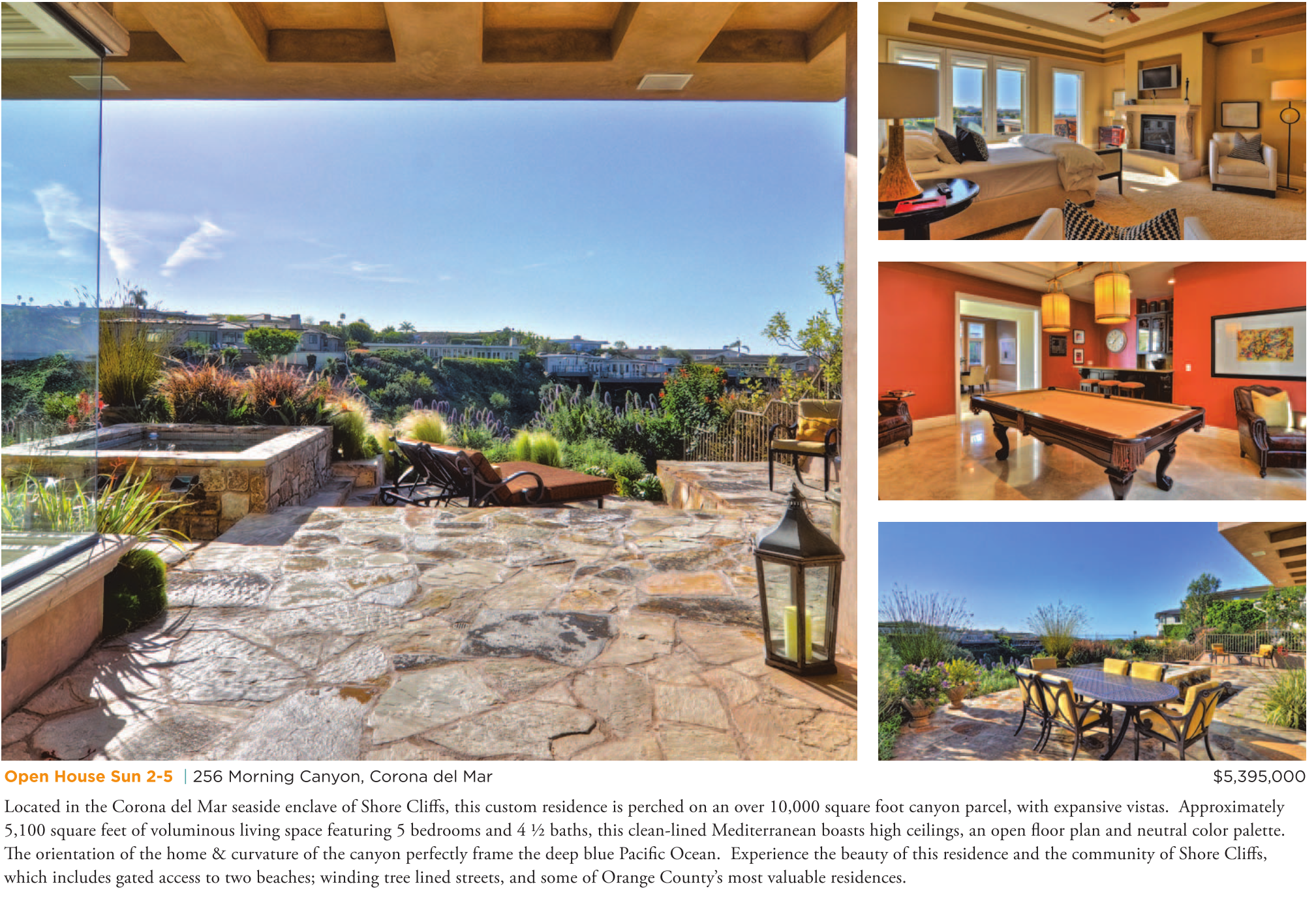 Open House Sun 2-5 | 256 Morning Canyon, Corona del Mar $5,395,000 Located in the Corona del Mar seaside enclave of Shore Cliffs, this custom residence is perched on an over 10,000 square foot canyon parcel, with expansive vistas. Approximately 5,100 square feet of voluminous living space featuring 5 bedrooms and 4 ½ baths, this clean-lined Mediterranean boasts high ceilings, an open floor plan and neutral color palette. The orientation of the home & curvature of the canyon perfectly frame the deep blue Pacific Ocean. Experience the beauty of this residence and the community of Shore Cliffs, which includes gated access to two beaches; winding tree lined streets, and some of Orange County’s most valuable residences.
