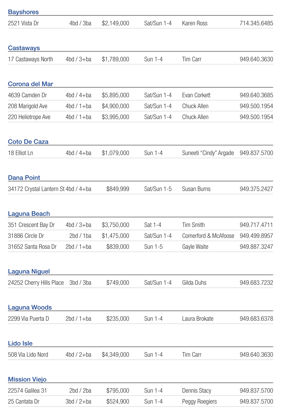 Bayshores 2521 Vista Dr 4bd / 3ba $2,149,000 Sat/Sun 1-4 Karen Ross 714.345.6485 Castaways 17 Castaways North 4bd / 3+ba $1,789,000 Sun 1-4 Tim Carr 949.640.3630 Corona del Mar 4639 Camden Dr 4bd / 4+ba $5,895,000 Sat/Sun 1-4 Evan Corkett 949.640.3685 208 Marigold Ave 4bd / 1+ba $4,900,000 Sat/Sun 1-4 Chuck Allen 949.500.1954 220 Heliotrope Ave 4bd / 1+ba $3,995,000 Sat/Sun 1-4 Chuck Allen 949.500.1954 Coto De Caza 18 Elliot Ln 4bd / 4+ba $1,079,000 Sun 1-4 Suneeti “Cindy” Argade 949.837.5700