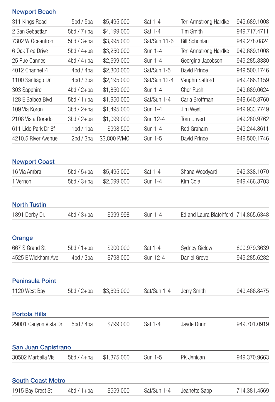 Newport Beach 311 Kings Road 5bd / 5ba $5,495,000 Sat 1-4 Teri Armstrong Hardke 949.689.1008 2 San Sebastian 5bd / 7+ba $4,199,000 Sat 1-4 Tim Smith 949.717.4711 7302 W Oceanfront 5bd / 3+ba $3,995,000 Sat/Sun 11-6 Bill Schonlau 949.278.0824 6 Oak Tree Drive 5bd / 4+ba $3,250,000 Sun 1-4 Teri Armstrong Hardke 949.689.1008 25 Rue Cannes 4bd / 4+ba $2,699,000 Sun 1-4 Georgina Jacobson 949.285.8380 4012 Channel Pl 4bd / 4ba $2,300,000 Sat/Sun 1-5 David Prince 949.500.1746 1100 Santiago Dr 4bd / 3ba $2,195,000 Sat/Sun 12-4 Vaughn Safford 949.466.1159 303 Sapphire 4bd / 2+ba $1,850,000 Sun 1-4 Cher Rush 949.689.0624 128 E Balboa Blvd 5bd / 1+ba $1,950,000 Sat/Sun 1-4 Carla Broffman 949.640.3760 109 Via Koron 3bd / 2+ba $1,495,000 Sun 1-4 Jim West 949.933.7749 2108 Vista Dorado 3bd / 2+ba $1,099,000 Sun 12-4 Tom Unvert 949.280.9762 611 Lido Park Dr 8f 1bd / 1ba $998,500 Sun 1-4 Rod Graham 949.244.8611 4210.5 River Avenue 2bd / 3ba $3,800 P/MO Sun 1-5 David Prince 949.500.1746