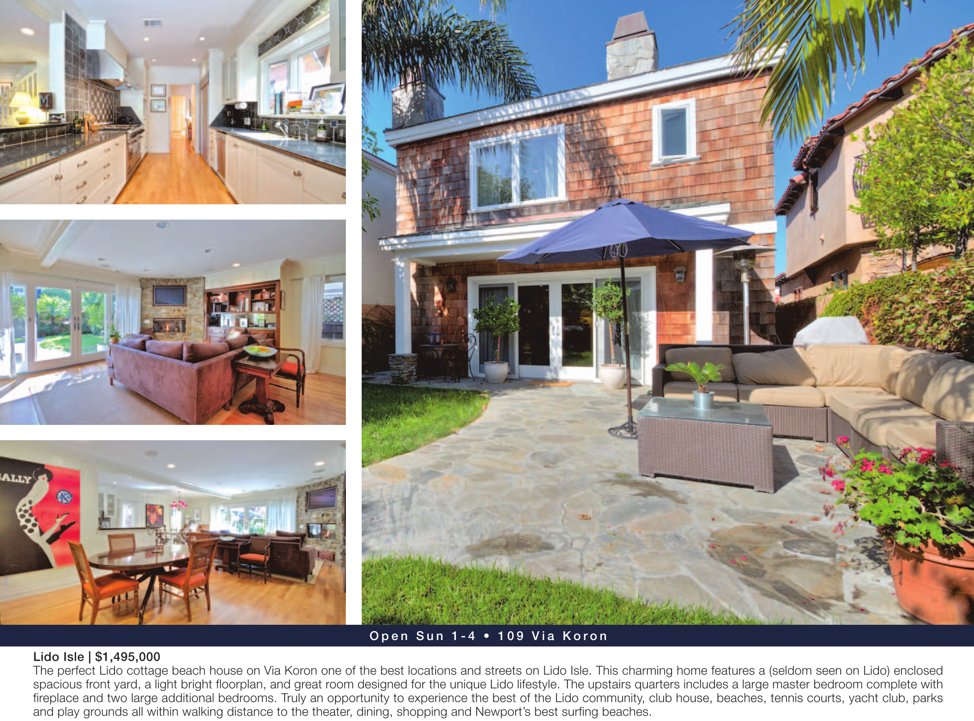 Open Sun 1-4 • 109 Via Koron Lido Isle | $1,495,000 The perfect Lido cottage beach house on Via Koron one of the best locations and streets on Lido Isle. This charming home features a (seldom seen on Lido) enclosed spacious front yard, a light bright floorplan, and great room designed for the unique Lido lifestyle. The upstairs quarters includes a large master bedroom complete with fireplace and two large additional bedrooms. Truly an opportunity to experience the best of the Lido community, club house, beaches, tennis courts, yacht club, parks and play grounds all within walking distance to the theater, dining, shopping and Newport’s best surfing beaches.