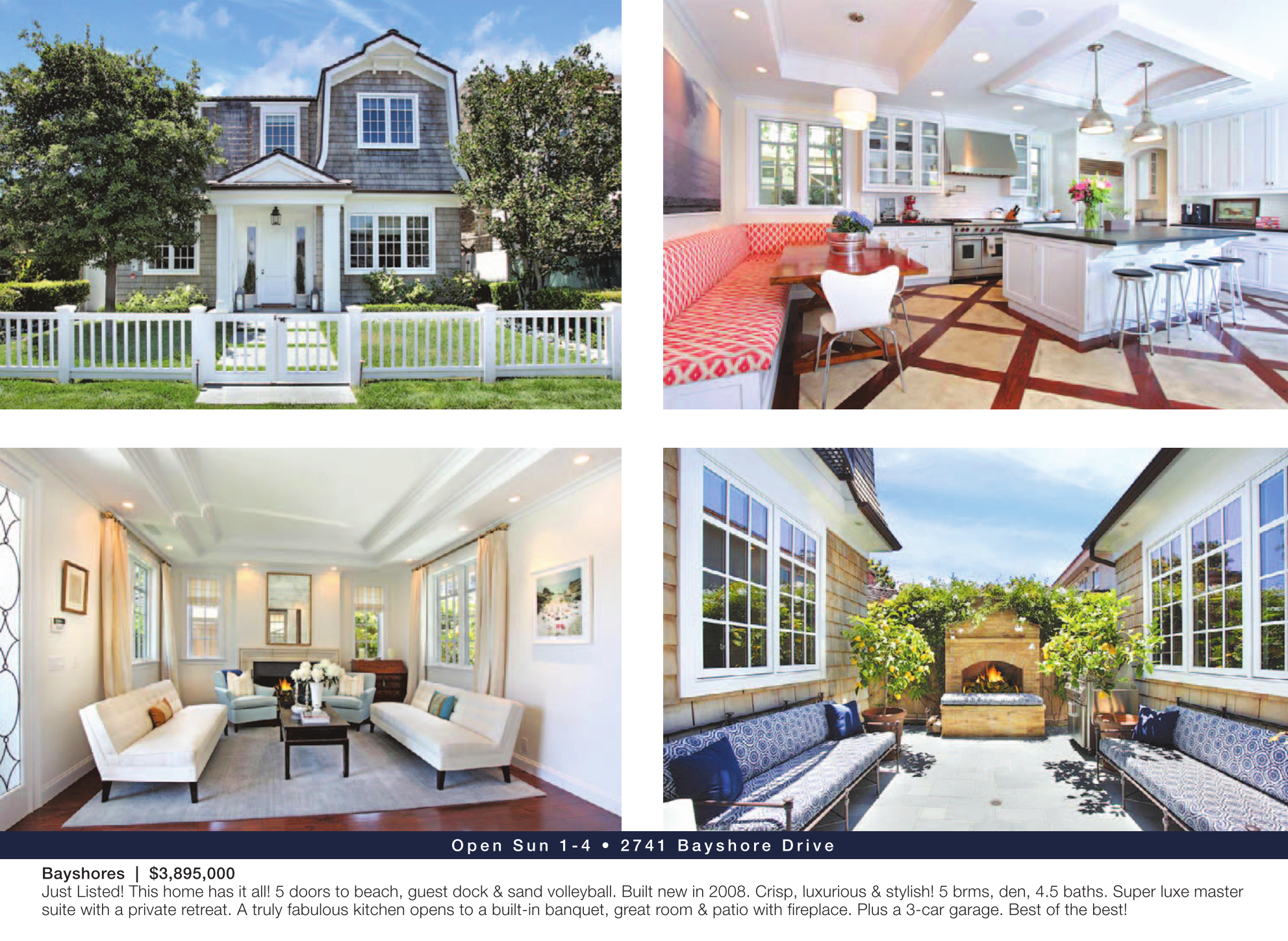 Open Sun 1-4 • 2741 Bayshore Drive Bayshores | $3,895,000 Just Listed! This home has it all! 5 doors to beach, guest dock & sand volleyball. Built new in 2008. Crisp, luxurious & stylish! 5 brms, den, 4.5 baths. Super luxe master suite with a private retreat. A truly fabulous kitchen opens to a built-in banquet, great room & patio with fireplace. Plus a 3-car garage. Best of the best!