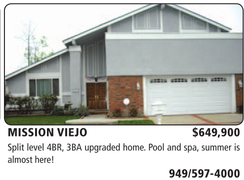 MISSION VIEJO $649,900 Split level 4BR, 3BA upgraded home. Pool and spa, summer is almost here!