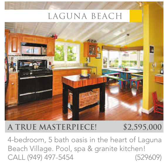 A TRUE MASTERPIECE! $2,595,000 4-bedroom, 5 bath oasis in the heart of Laguna Beach Village. Pool, spa & granite kitchen! CALL (949) 497-5454 (529609)