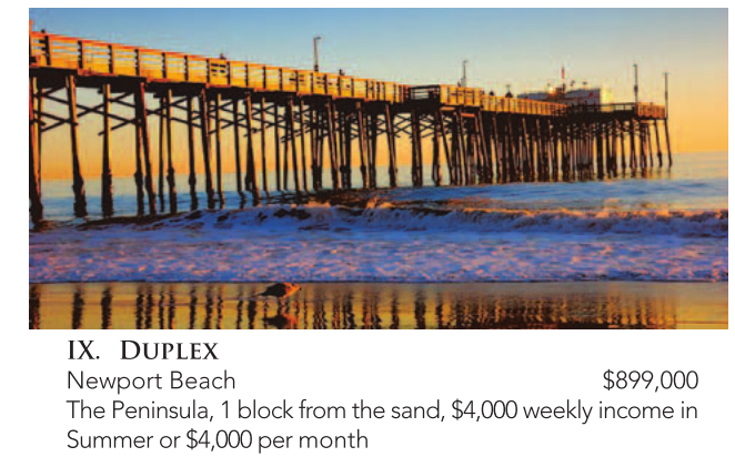 IX. Duplex Newport Beach $899,000 The Peninsula, 1 block from the sand, $4,000 weekly income in Summer or $4,000 per month