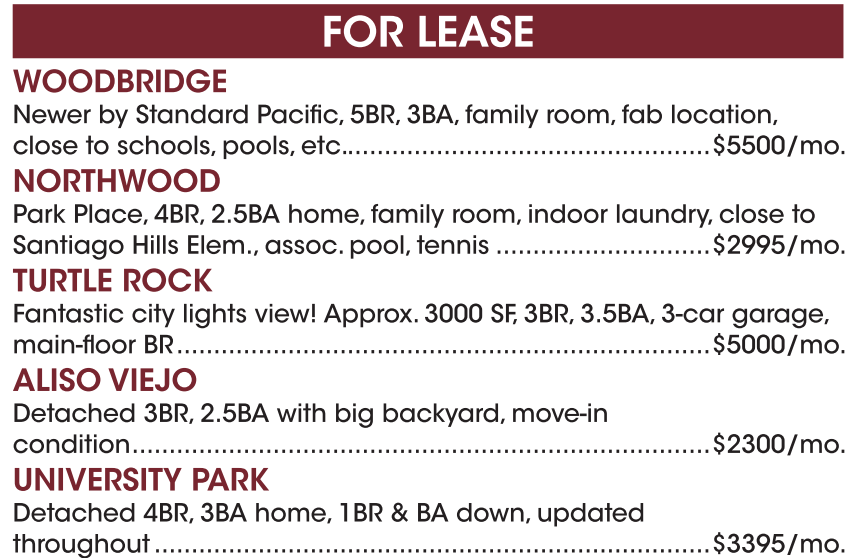 WOODBRIDGE Newer by Standard Pacific, 5BR, 3BA, family room, fab location, close to schools, pools, etc. .................................................$5500/mo. NORTHWOOD Park Place, 4BR, 2.5BA home, family room, indoor laundry, close to Santiago Hills Elem., assoc. pool, tennis .............................$2995/mo. TURTLE ROCK Fantastic city lights view! Approx. 3000 SF, 3BR, 3.5BA, 3-car garage, main-floor BR ........................................................................$5000/mo. ALISO VIEJO Detached 3BR, 2.5BA with big backyard, move-in condition ..............................................................................$2300/mo. UNIVERSITY PARK Detached 4BR, 3BA home, 1BR & BA down, updated throughout ...........................................................................$3395/mo.
