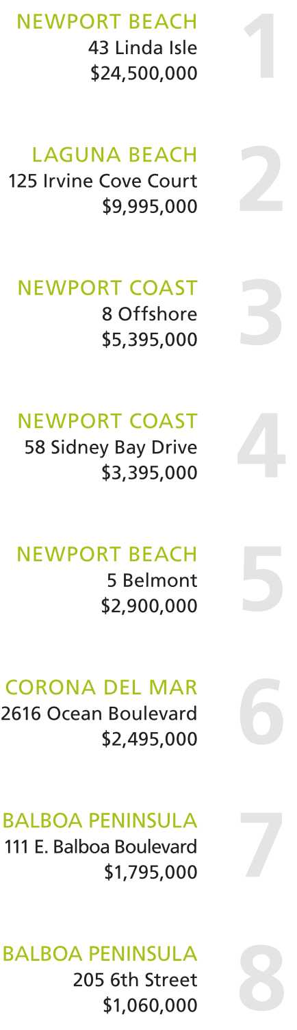 NEWPORT BEACH 43 Linda Isle $24,500,000 LAGUNA BEACH 125 Irvine Cove Court $9,995,000 1 2 NEWPORT COAST 8 Offshore $5,395,000 3 NEWPORT COAST 58 Sidney Bay Drive $3,395,000 4 NEWPORT BEACH 5 Belmont $2,900,000 5 CORONA DEL MAR 2616 Ocean Boulevard $2,495,000 6 BALBOA PENINSULA 111 E. Balboa Boulevard $1,795,000 7 BALBOA PENINSULA 205 6th Street $1,060,000 8