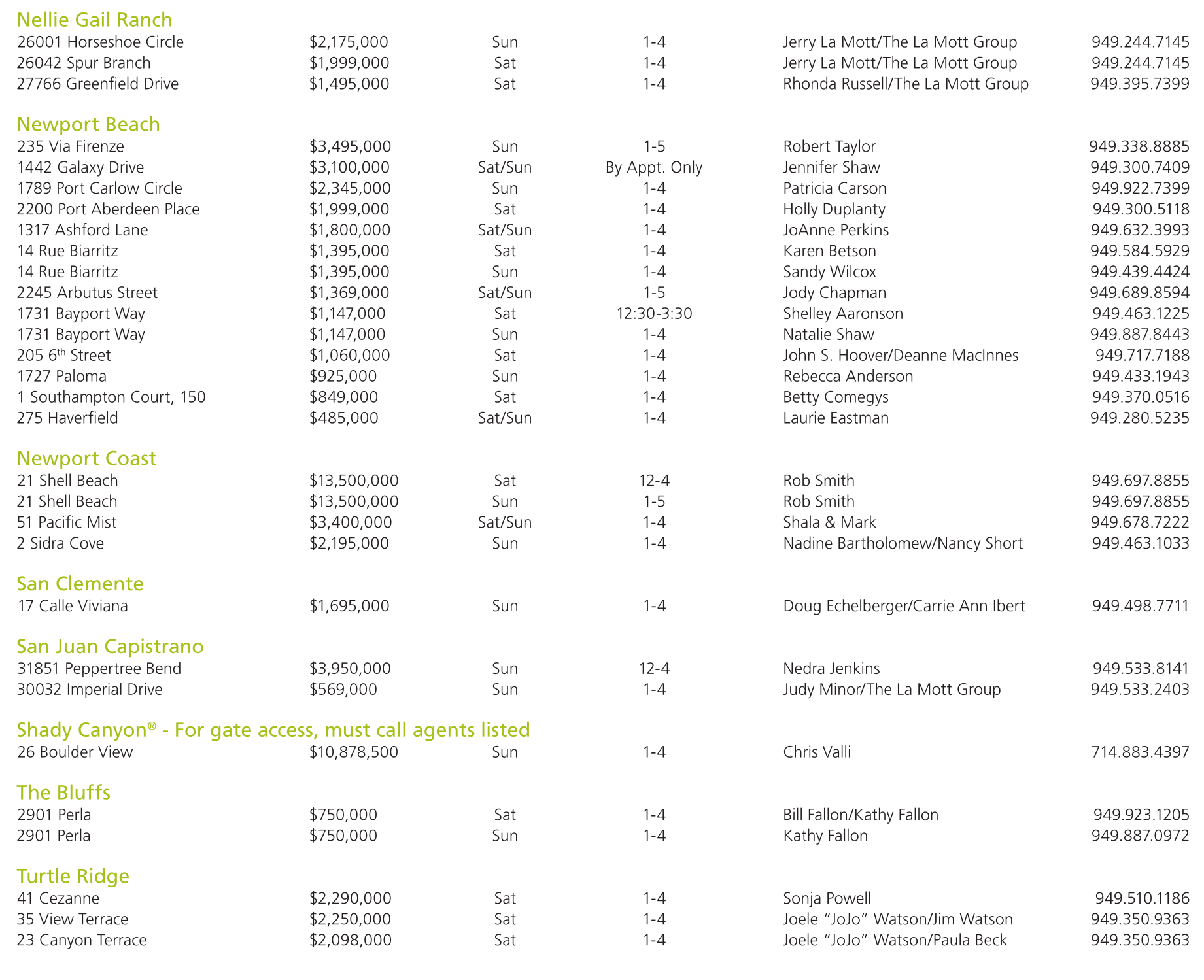 Nellie Gail Ranch 26001 Horseshoe Circle $2,175,000 Sun 1-4 Jerry La Mott/The La Mott Group 949.244.7145 26042 Spur Branch $1,999,000 Sat 1-4 Jerry La Mott/The La Mott Group 949.244.7145 27766 Greenfield Drive $1,495,000 Sat 1-4 Rhonda Russell/The La Mott Group 949.395.7399 Newport Beach 235 Via Firenze $3,495,000 Sun 1-5 Robert Taylor 949.338.8885 1442 Galaxy Drive $3,100,000 Sat/Sun By Appt. Only Jennifer Shaw 949.300.7409 1789 Port Carlow Circle $2,345,000 Sun 1-4 Patricia Carson 949.922.7399 2200 Port Aberdeen Place $1,999,000 Sat 1-4 Holly Duplanty 949.300.5118 1317 Ashford Lane $1,800,000 Sat/Sun 1-4 JoAnne Perkins 949.632.3993 14 Rue Biarritz $1,395,000 Sat 1-4 Karen Betson 949.584.5929 14 Rue Biarritz $1,395,000 Sun 1-4 Sandy Wilcox 949.439.4424 2245 Arbutus Street $1,369,000 Sat/Sun 1-5 Jody Chapman 949.689.8594 1731 Bayport Way $1,147,000 Sat 12:30-3:30 Shelley Aaronson 949.463.1225 1731 Bayport Way $1,147,000 Sun 1-4 Natalie Shaw 949.887.8443 205 6 th Street $1,060,000 Sat 1-4 John S. Hoover/Deanne MacInnes 949.717.7188 1727 Paloma $925,000 Sun 1-4 Rebecca Anderson 949.433.1943 1 Southampton Court, 150 $849,000 Sat 1-4 Betty Comegys 949.370.0516 275 Haverfield $485,000 Sat/Sun 1-4 Laurie Eastman 949.280.5235 Newport Coast 21 Shell Beach $13,500,000 Sat 12-4 Rob Smith 949.697.8855 21 Shell Beach $13,500,000 Sun 1-5 Rob Smith 949.697.8855 51 Pacific Mist $3,400,000 Sat/Sun 1-4 Shala & Mark 949.678.7222 2 Sidra Cove $2,195,000 Sun 1-4 Nadine Bartholomew/Nancy Short 949.463.1033 San Clemente 17 Calle Viviana $1,695,000 Sun 1-4 Doug Echelberger/Carrie Ann Ibert 949.498.7711 San Juan Capistrano 31851 Peppertree Bend $3,950,000 Sun 12-4 Nedra Jenkins 949.533.8141 30032 Imperial Drive $569,000 Sun 1-4 Judy Minor/The La Mott Group 949.533.2403 Shady Canyon ® - For gate access, must call agents listed 26 Boulder View $10,878,500 Sun 1-4 Chris Valli 714.883.4397 The Bluffs 2901 Perla $750,000 Sat 1-4 Bill Fallon/Kathy Fallon 949.923.1205 2901 Perla $750,000 Sun 1-4 Kathy Fallon 949.887.0972 Turtle Ridge 41 Cezanne $2,290,000 Sat 1-4 Sonja Powell 949.510.1186 35 View Terrace $2,250,000 Sat 1-4 Joele “JoJo” Watson/Jim Watson 949.350.9363 23 Canyon Terrace $2,098,000 Sat 1-4 Joele “JoJo” Watson/Paula Beck 949.350.9363