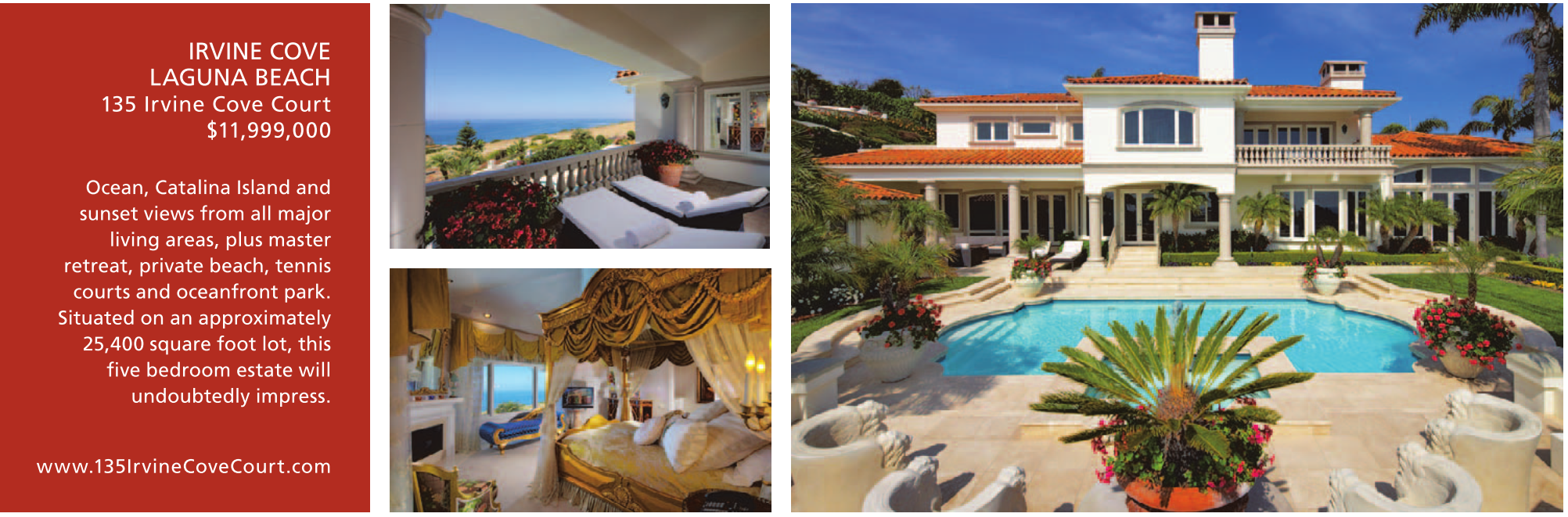 IRVINE COVE LAGUNA BEACH 135 Irvine Cove Court $11,999,000 Ocean, Catalina Island and sunset views from all major living areas, plus master retreat, private beach, tennis courts and oceanfront park. Situated on an approximately 25,400 square foot lot, this five bedroom estate will undoubtedly impress. www.135IrvineCoveCourt.com