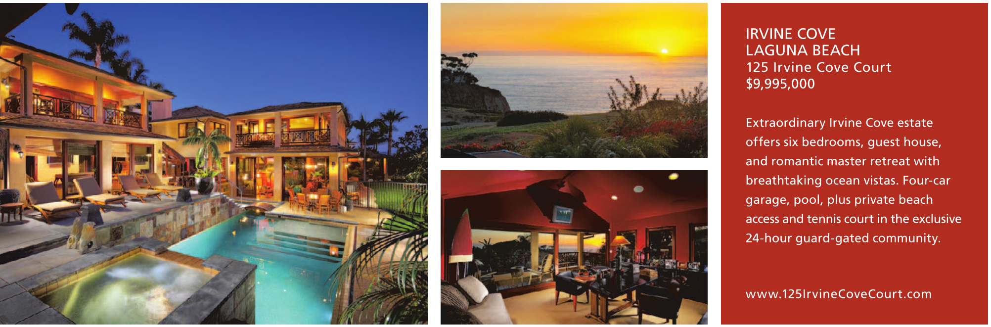 IRVINE COVE LAGUNA BEACH 125 Irvine Cove Court $9,995,000 Extraordinary Irvine Cove estate offers six bedrooms, guest house, and romantic master retreat with breathtaking ocean vistas. Four-car garage, pool, plus private beach access and tennis court in the exclusive 24-hour guard-gated community. www.125IrvineCoveCourt.com