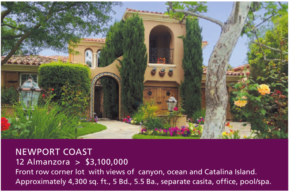 NEWPORT COAST 12 Almanzora > $3,100,000 Front row corner lot with views of canyon, ocean and Catalina Island. Approximately 4,300 sq. ft., 5 Bd., 5.5 Ba., separate casita, office, pool/spa.