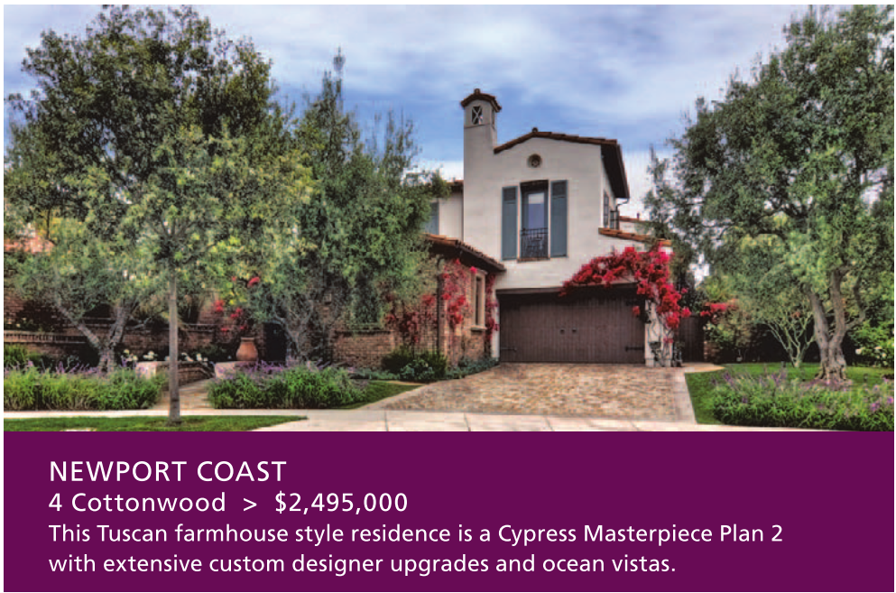 NEWPORT COAST 4 Cottonwood > $2,495,000 This Tuscan farmhouse style residence is a Cypress Masterpiece Plan 2 with extensive custom designer upgrades and ocean vistas.