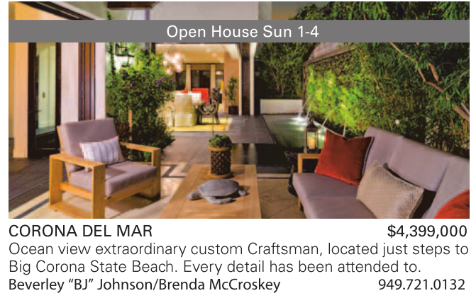 CORONA DEL MAR $4,399,000 Ocean view extraordinary custom Craftsman, located just steps to Big Corona State Beach. Every detail has been attended to. Beverley “BJ” Johnson/Brenda McCroskey 949.721.0132