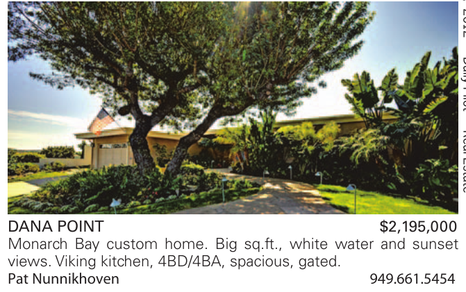DANA POINT $2,195,000 Monarch Bay custom home. Big sq.ft., white water and sunset views. Viking kitchen, 4BD/4BA, spacious, gated. Pat Nunnikhoven 949.661.5454